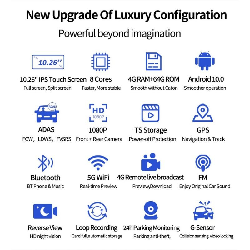 The D13 Dash Camera is not just a basic recording device—it’s an intelligent driving assistant built for the demands of today’s roads. With its sleek 10.26-inch touchscreen display and crisp 1600×600 resolution, navigating its features is a breeze. The powerful dual-camera setup ensures you capture both front and rear footage with crystal clarity, while built-in Wi-Fi, GPS, Bluetooth, and 4G network support make this camera future-ready. You get live remote monitoring, smart alerts via ADAS, and secure file saving with the G-sensor in emergencies. It even includes a built-in mic and speaker for two-way interaction. Whether you’re commuting through city traffic or heading out on long drives, the D13 acts as your digital co-pilot—silently recording, protecting, and keeping you informed every step of the way. Choose D13 not just to record the road but to drive smarter and safer with every journey.