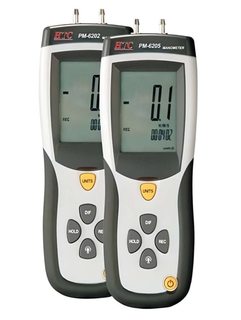 The device measures Gauge/Differential Pressure from 0 to 5 psi, it features 11 selectable units of measure: inH,0, psi, bar, mbar, kPa, inHg, mmHg, ozin’, ftH,0, cmH,0, kgcm², Additional features include Data Hold. Auto Power Off disabled, and an RS-232 for capturing reading to a PC using optional software. Careful use of this meter will provide years of reliable service.