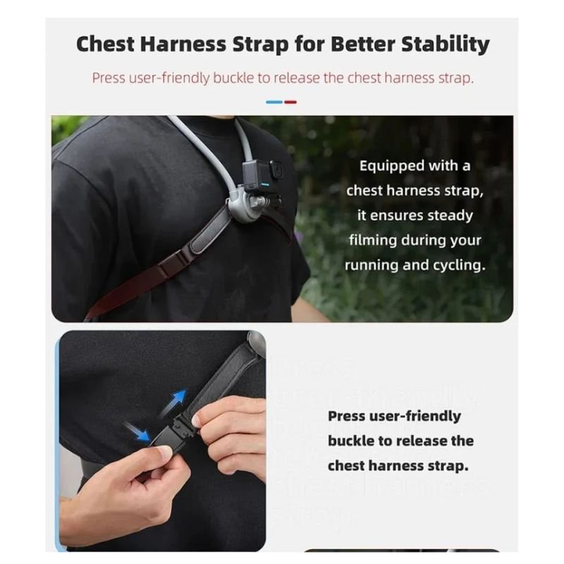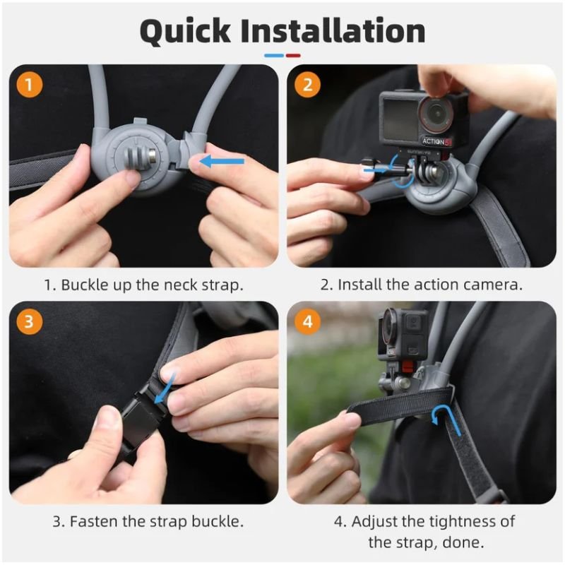 This Mount has a universal one-fourth inch interface & a quick-release attachment system that makes it compatible with DJI Osmo 360, DJI Action Series, Insta360 cameras, GoPro models, and virtually all action cameras. The installation process is easy. Attach the camera to the Mount; wear the Mount; adjust as desired, and begin recording.